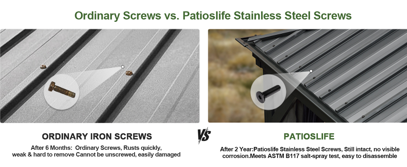 Ordinary screws rust and weaken within months. Patioslife Stainless Steel Screws stay strong and corrosion-free even after 2 years, meeting the ASTM B117 salt-spray test for durability you can trust.