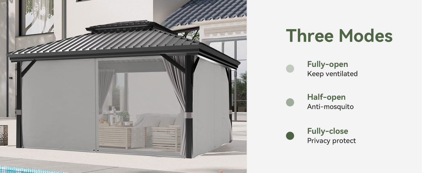 Our gazebo is built for year-round enjoyment — from summer sun to heavy rain and winter snow. The galvanized steel roof provides 99% UV protection and fade resistance, while the reinforced aluminum frame ensures stability. Withstands 40 mph (65 km/h) winds in standard setup, and up to 60+ mph (97+ km/h) with permanent concrete fixing.