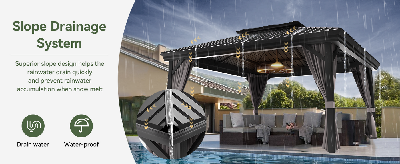 The superior slope design allows rainwater to drain quickly, preventing water pooling and ensuring smooth runoff when snow melts. This waterproof system keeps the gazebo dry and durable in all seasons.