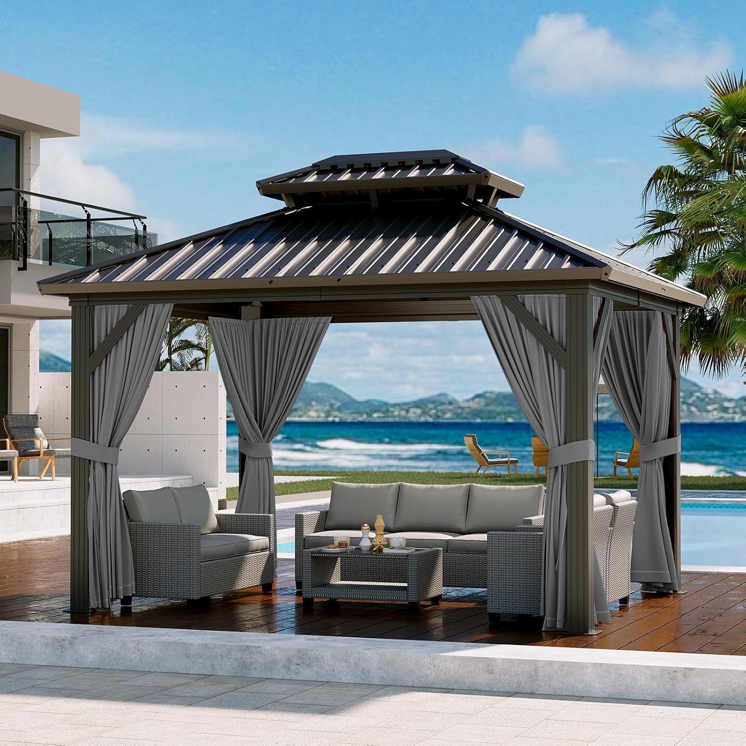 Patioslife Haven | Hardtop Gazebo with Drainage Gutters Aluminum Frame, Double Vented Roof & Curtains, Patio Pergola for Garden or Backyard