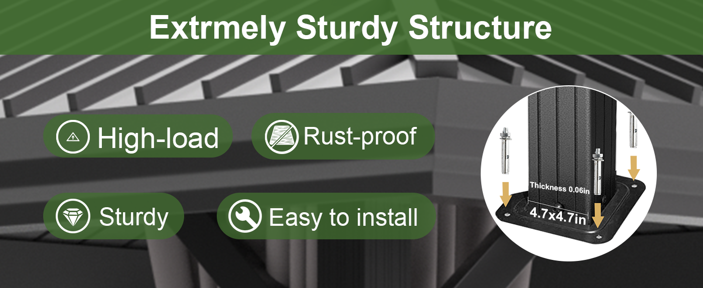 Our gazebo features a pre-drilled anchoring frame for secure setup on concrete or decking. The intuitive design with labeled parts makes assembly simple. With 4.7×4.7 in posts and 0.06in thick steel, it stays stable in strong winds and supports up to 1100lbs on the roof for lasting durability.