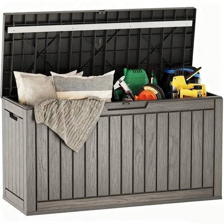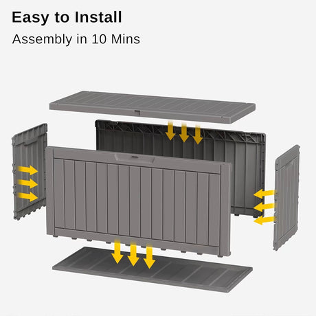 Waterproof Resin Outdoor Storage Box – 60, 90, and 120 Gallon Sizes – Lockable, UV Resistant Deck Storage Bin for Patio Cushions, Gardening Tools, and More – Grey