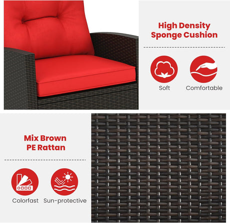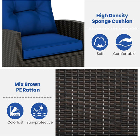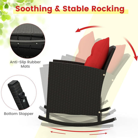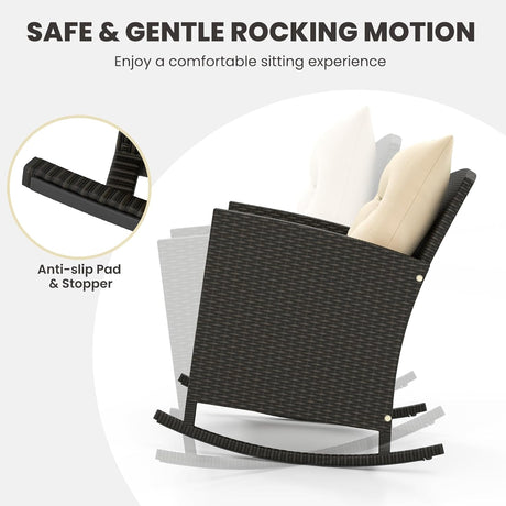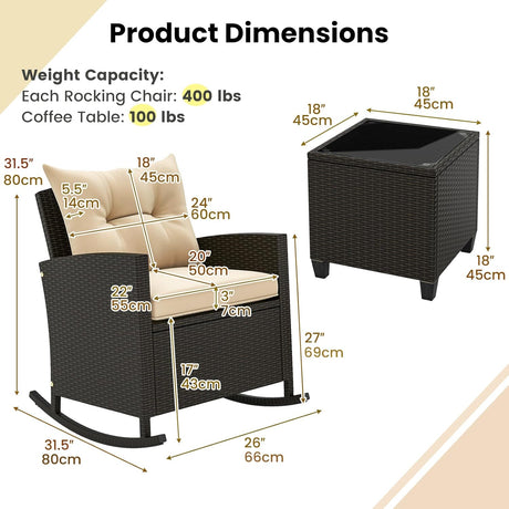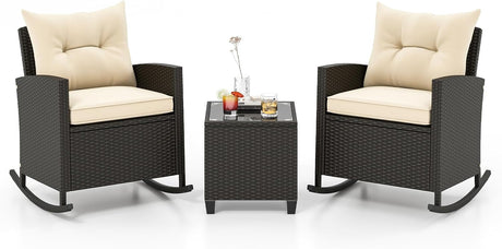 3-Piece Outdoor Wicker Rocking Chair Set – Patio Furniture with Soft Cushions & Glass Coffee Table – Rattan Bistro Set for Porch, Balcony, Garden, or Poolside