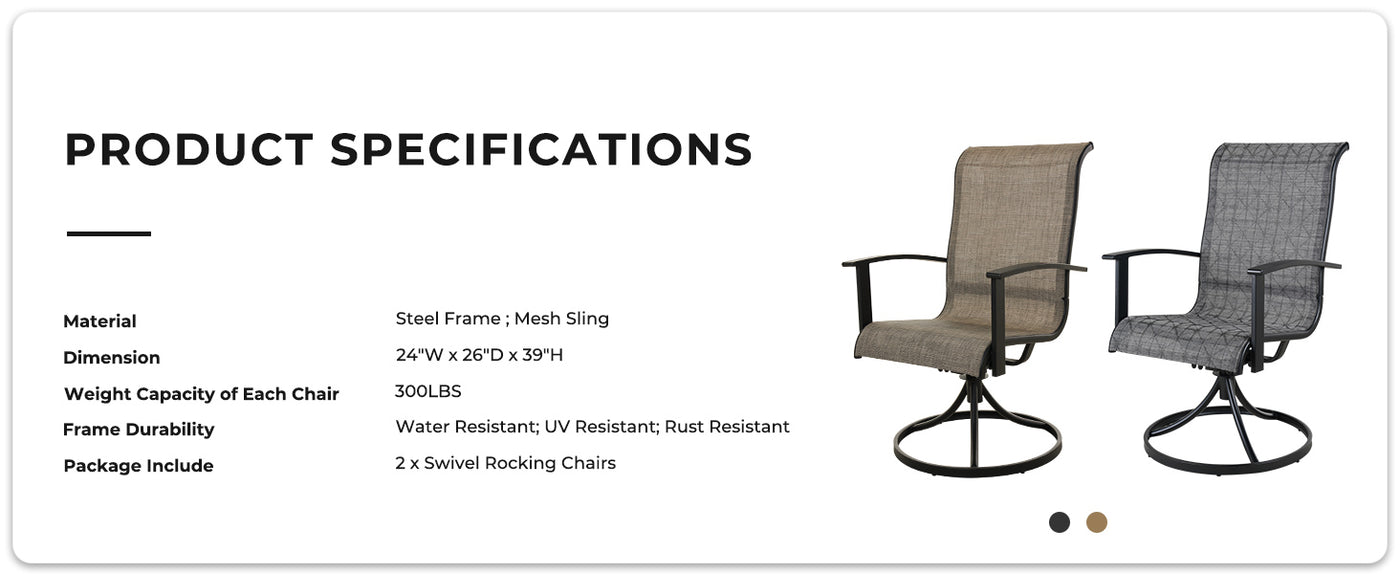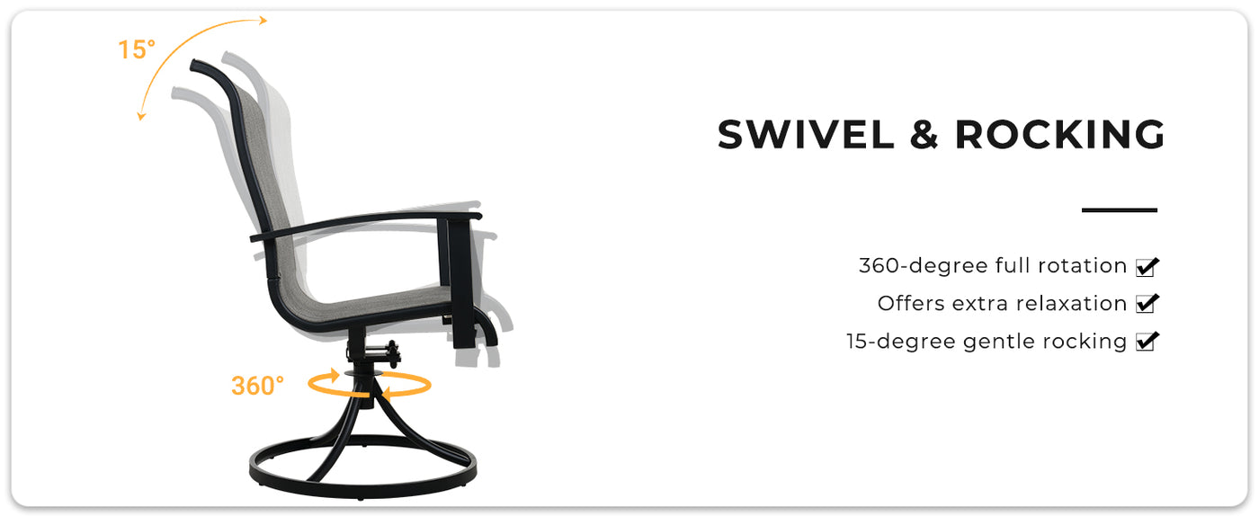 Enhance your outdoor relaxation with this swivel rocking patio chair set, combining smooth motion, ergonomic comfort, and long-lasting durability. Perfect for your patio, deck, garden, or porch, these chairs bring both function and style to your outdoor space.