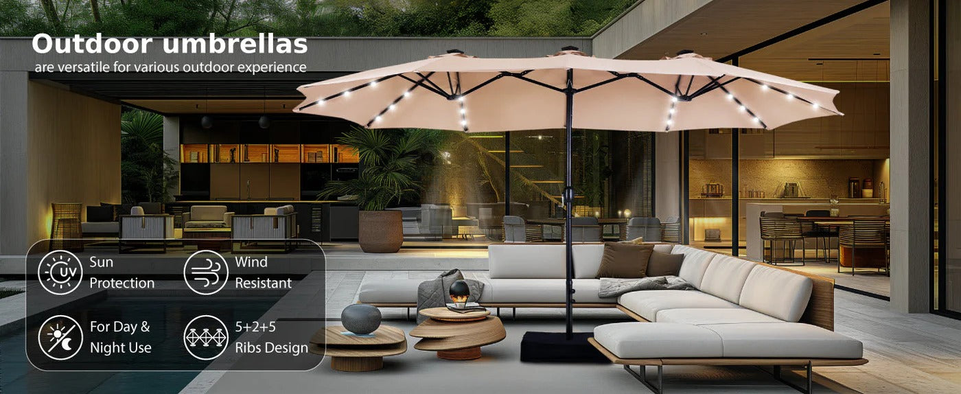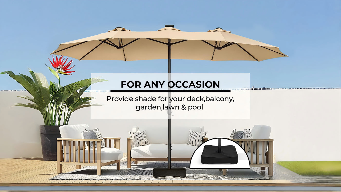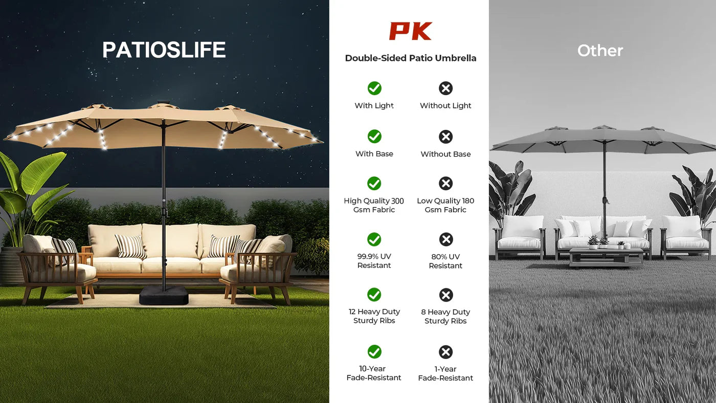 UV Protection: Defend against sun rays with UPF 50+ and 99.9% UV protection. Your shaded haven. blocking UVA and UVB rays for worry-free relaxation. 15ft double-sided patio umbrella has a larger shade area than conventional umbrellas and adequately covers multiple lounge chairs and large rectangular tables.