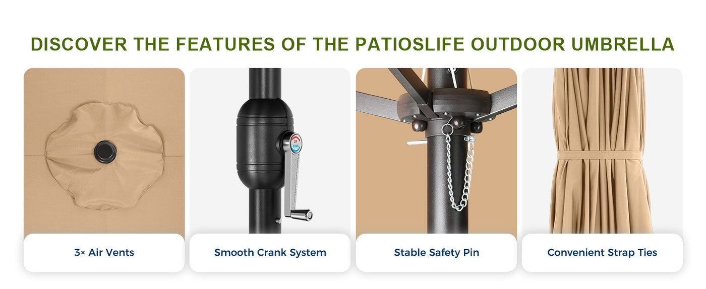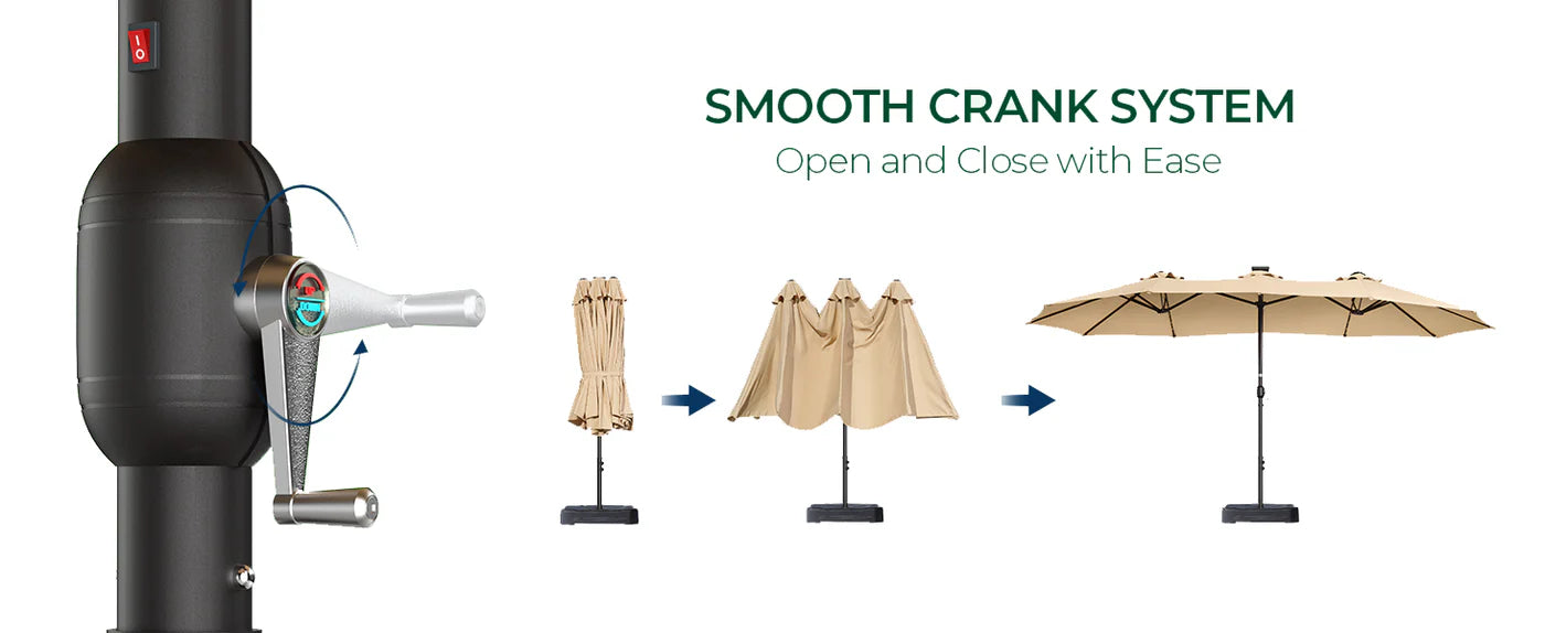 Easy Adjustment: A smooth crank system ensures that opening (clockwise) and closing (counterclockwise) the patio umbrella can be easily accomplished in seconds.
