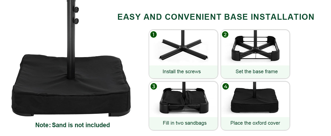 Base Included: A sturdy base can be filled with more than 50lb of sand for each sandbag. No more worries about the wind. enjoy a stable and worry-free outdoor experience!