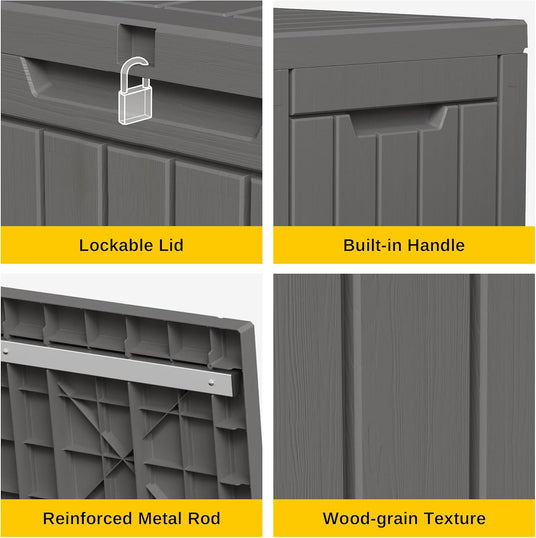 Waterproof Resin Outdoor Storage Box – 60, 90, and 120 Gallon Sizes – Lockable, UV Resistant Deck Storage Bin for Patio Cushions, Gardening Tools, and More – Grey